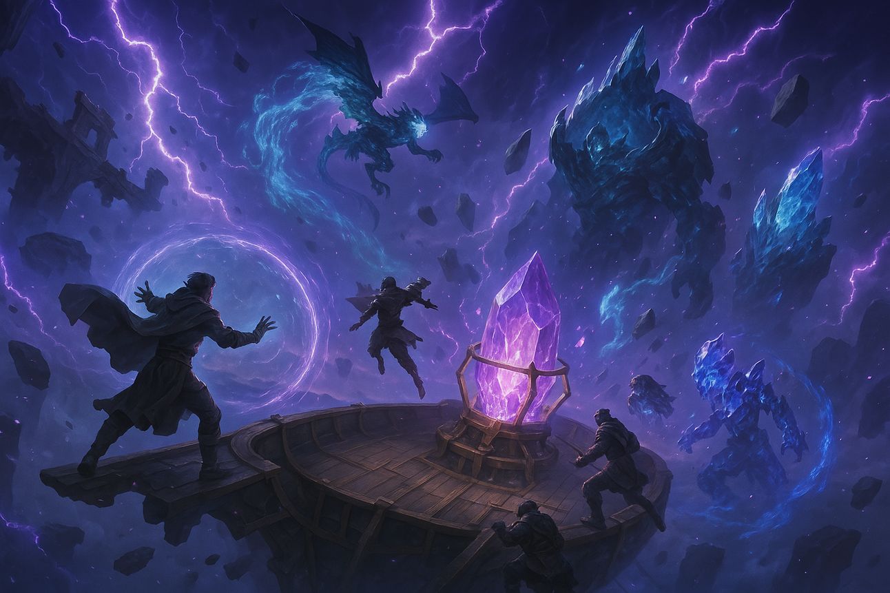 While transporting a shard fragment aboard a small sky barge, the party is ambushed mid-air by wind-scythe elementals and rogue Arbiters on gliders. Players must balance combat, navigation, and protecting the cargo, as rifts open in the air.