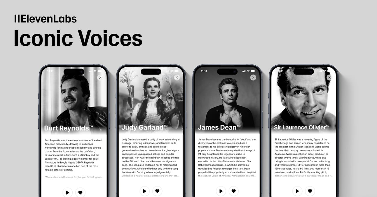 ElevenLabs launches Iconic Voices - Listen to your favorite books and articles voiced by Judy Garland, James Dean, Burt Reynolds and Sir Laurence Olivier on our Reader App.