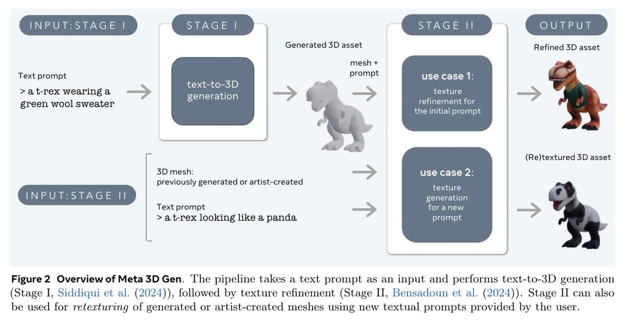 Meta 3D Gen - Meta 3D Gen (3DGen) emerges as a groundbreaking technology in computer vision, with capabilities to convert text to 3D assets swiftly, boasting both high fidelity to the input prompts and top-tier 3D quality. Featuring physically-based rendering, it caters to real-world relighting demands and extends its utility with generative retexturing for existing 3D models. 3DGen merges Meta 3D AssetGen and Meta 3D TextureGen, formidable for text-to-3D and text-to-texture generation. This synthesis yields detailed representations across view, volumetric, and texture spaces. Superior to industry standards, 3DGen registers a 68% win rate over single-stage models and excels in speed, accurate prompt response, and complex image quality.