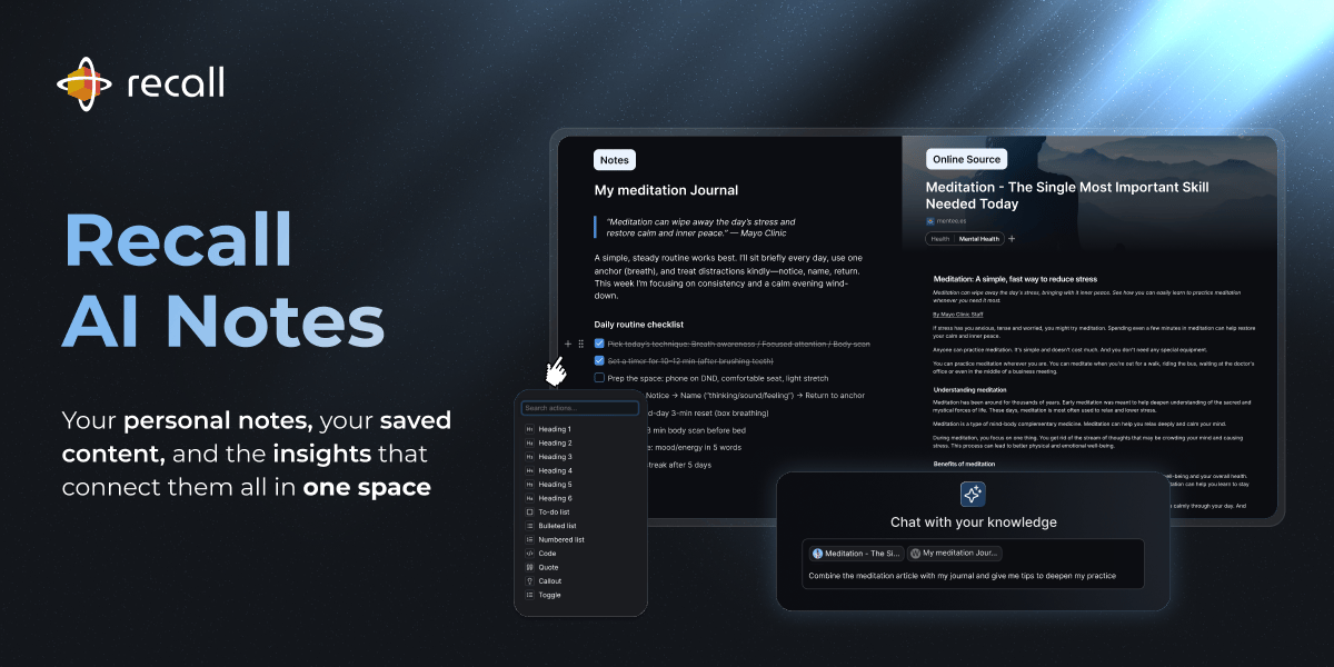 Recall is a self-organizing knowledge base for everything you consume online AND create, with a new Notion-style editor.