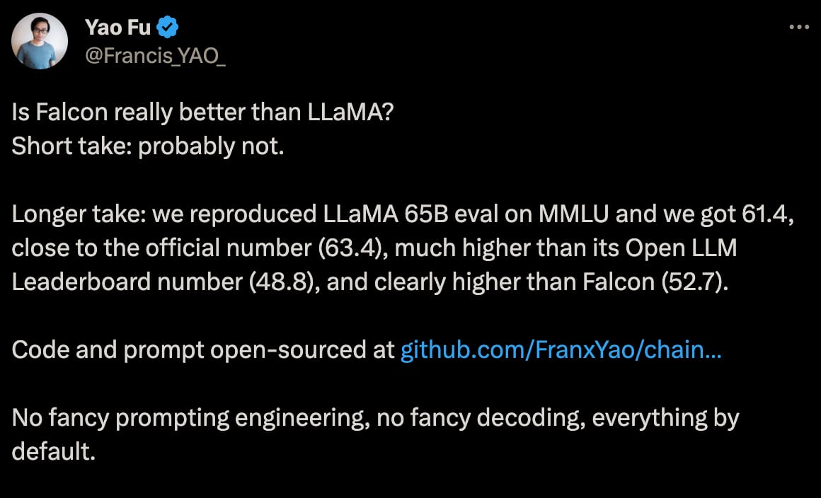 This week, there was also some drama in how the LLM Leaderboard benchmarks are calculated. The short of it is there is no consistency, and it’s still the wild west. The main issue is many AI leaders were surprised to see LLaMA 65b perform significantly worse than the newly released Falcon model. It turns out it performs much better when all things are equal. Follow the news here.