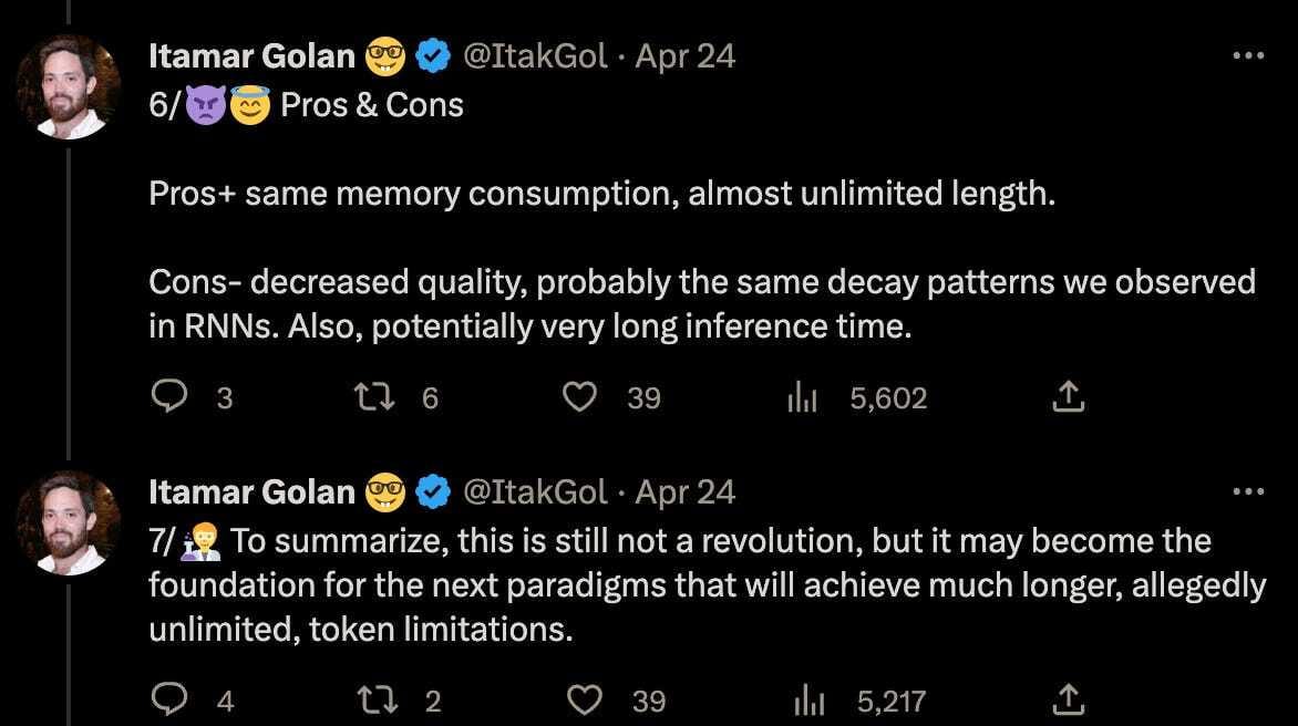 Another potential solution was published in a research paper this week: Scaling Transformer to 1M tokens and beyond with RMT. In this paper, they claim to achieve prompt lengths of over 2 million tokens, which is insane. That means you can fit the entire Harry Potter series of books into a single prompt (1 million words) with plenty left to spare. However, there have been some rebuttals to this paper’s approach.