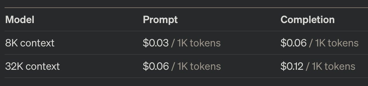 For 32,000 tokens, the maximum allowed in GPT-4, it would cost between $1-3 for the prompt and another $1-3 for the response. Certainly not expensive, but the costs could snowball for certain use cases. I’m sure OpenAI is working towards bringing that cost down, given it is a significant differentiator for them.