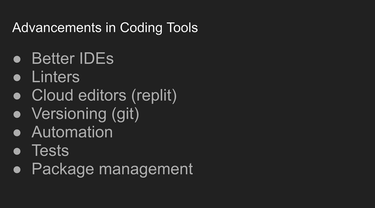 Definitely, it's a lot better than it used to be. We've even had enormous advancements in coding tools. We now have better IDEs, and engineers can have every customization they could possibly think of. We have linters, cloud editors so you can collaborate with other people anywhere in the world, versioning to keep track of our progress, and the ability to revert changes if we make a mistake. We have automation, tests, package management (even though that doesn't really work all that well still for Python), syntax highlighting, and potential bug warnings. I mean, we really do have a wide range of tools that we can use today. But programming is still super hard.