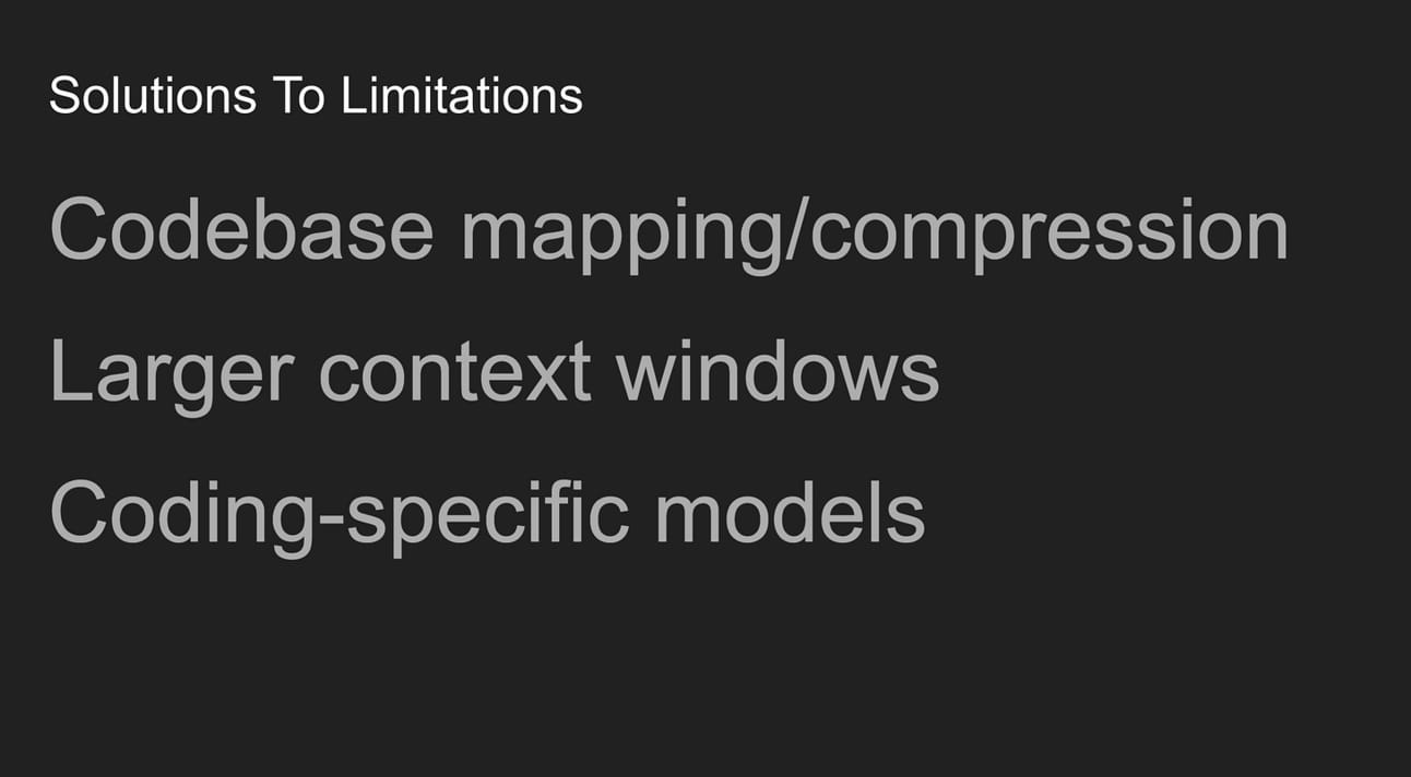 So, there are a few solutions to the current limitations. One is codebase mapping or compression, basically taking massive codebases and mapping them using shorthand that large language models can understand. A project that I've reviewed that does this really well is called AIDER, and they use something called Universal CAGs to define in shorthand all of the methods and all of the code that you have in your codebase. Then, they are able to feed that very compressed mapped version into a large language model so it can actually understand an entire codebase. This is also why most AI coding projects want you to start from scratch and can't iterate on existing codebases; it's for this exact problem. But this problem will be solved, whether it's from increased context sizes, solving the "lost in the middle" problem, or mapping and compressing codebases so that large language models can understand them easily. Additionally, we're going to be fine-tuning models specific to coding tasks, making models that were already good at coding even better.