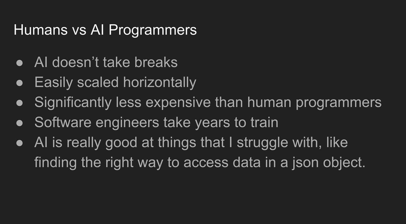 AI coders are not only much faster at coding, but they're much less expensive too. Software engineers take years of training to become good. AI is going to be trained once, and it's going to be good no matter how much you scale that horizontally. AI is really good at the things I personally struggle with, like finding the right way to access data that's hidden deep in a JSON object or remembering the syntax for some random piece of code that I have to write.
