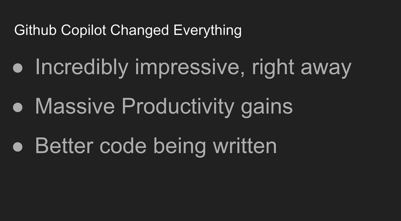 Then, in 2022, GitHub Copilot changed everything. For $10 a month, you can have an AI assistant to help you write code. It was incredibly impressive right away. Just write a few words, and it will complete entire methods for you. There were enormous productivity gains from this, and better code was being written. I really cannot overstate how important GitHub Copilot is. When we look back at the history of programming evolution, GitHub Copilot is going to be an inflection point.