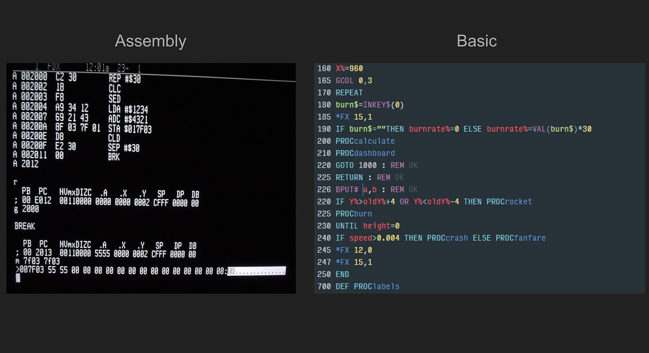 Look at what we started with. On the left, we have assembly code, and it is not friendly to humans. Then we got BASIC, and it became a little bit easier; you can start to see it looks a little bit like natural language. Then we had C and Java, JavaScript, and things became easier. We had more libraries and were able to have object-oriented programming. We started to craft programming in a way that made it easier for humans to understand. And now, we have more modern programming languages like Python and Go, which, if you look at them, they look pretty similar to natural language. Obviously, it's not perfect, and if you miss a character here and there, the software is still not going to work, but it is definitely a lot better than it used to be.