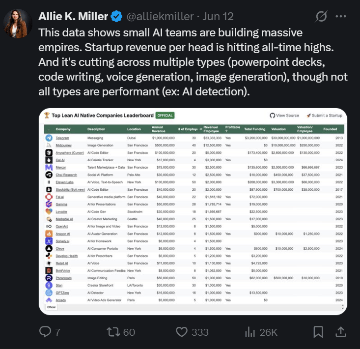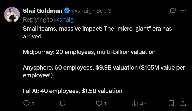 The most visible tremor of this fracture is reshaping the economy. The traditional link between scale, manpower, and value creation has been severed. Consider the generative art platform, Midjourney. In 2023, with just 11 employees, the self-funded company reached an estimated annual recurring revenue (ARR) of $200 million. By 2024, with a team of only 40, it was reportedly approaching $500 million in annual revenue. This translates to an ARR per employee of up to $18.2 million, a figure that shatters the benchmarks of traditional SaaS companies, which typically range from $200k to $500k.