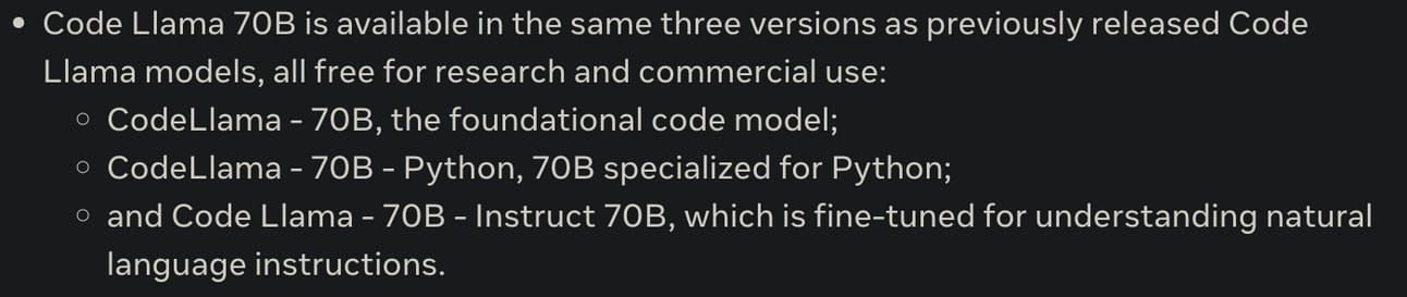 Embracing the spirit of innovation, Code Llama 70B is released for research and commercial use. This move is particularly exciting for developers and companies looking to leverage cutting-edge AI in their projects without the constraints often imposed by licensing. Meta's open-source philosophy not only accelerates the pace of technological advancement but also fosters a community of collaboration and shared progress. You can easily use Code LLaMA 70b in VSCode using something like Ollama or LMStudio. Let me know if you want to see an in-depth tutorial on this.